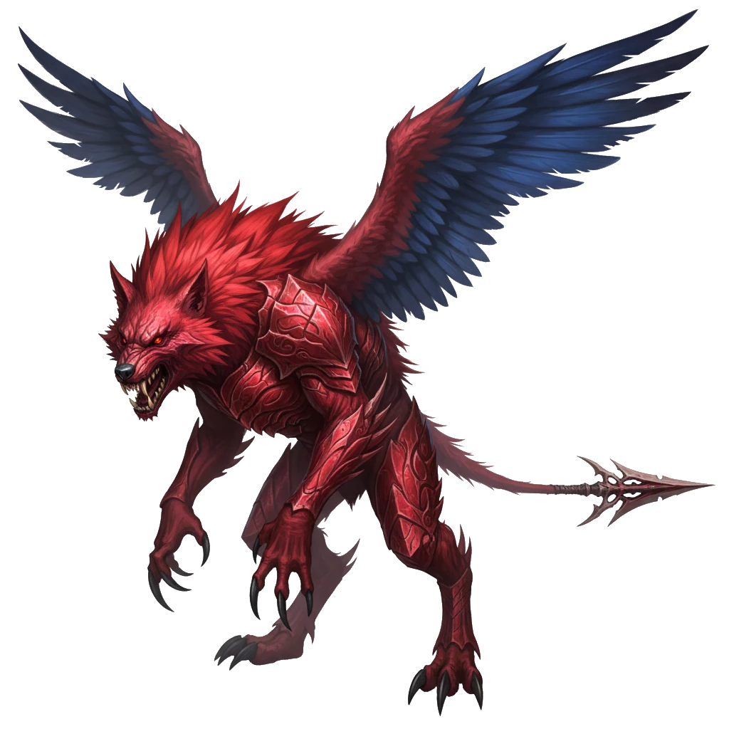 翼の生えた巨大な狼。鋭い爪牙を持ち、硬い毛皮の上に血で象られた鎧を着ている。毛は鋭い針と化し射出できる。